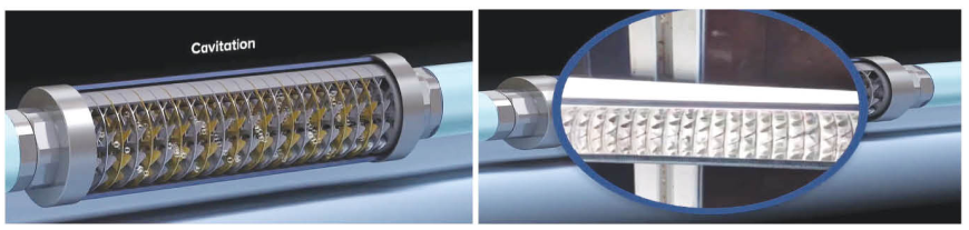 • Từ các turbin lốc xoáy, nước sẽ tạo ra hiện tượng bọt khí bên trong thiết bị, làm tăng tương tác của nước. Khi nước chảy qua turbin sẽ sinh ra dòng điện từ tính sẽ giúp chuyển hóa CaCO3 dạng rắn sang Aragonite dạng cát dễ tan và không bám trên thành ống cũng như thiết bị vệ sinh sẽ chảy theo nước ra ngoài.