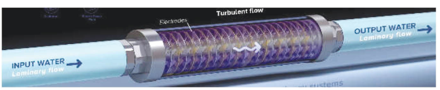 • IPS KalyxX là một cơ thể dòng chảy với các điện cực hình turbin được đặt bên trong bằng hai vật liệu dẫn điện khác nhau và tạo ra dòng nước xoáy, gây ra sự thay đổi cấu trúc của khoáng chất.